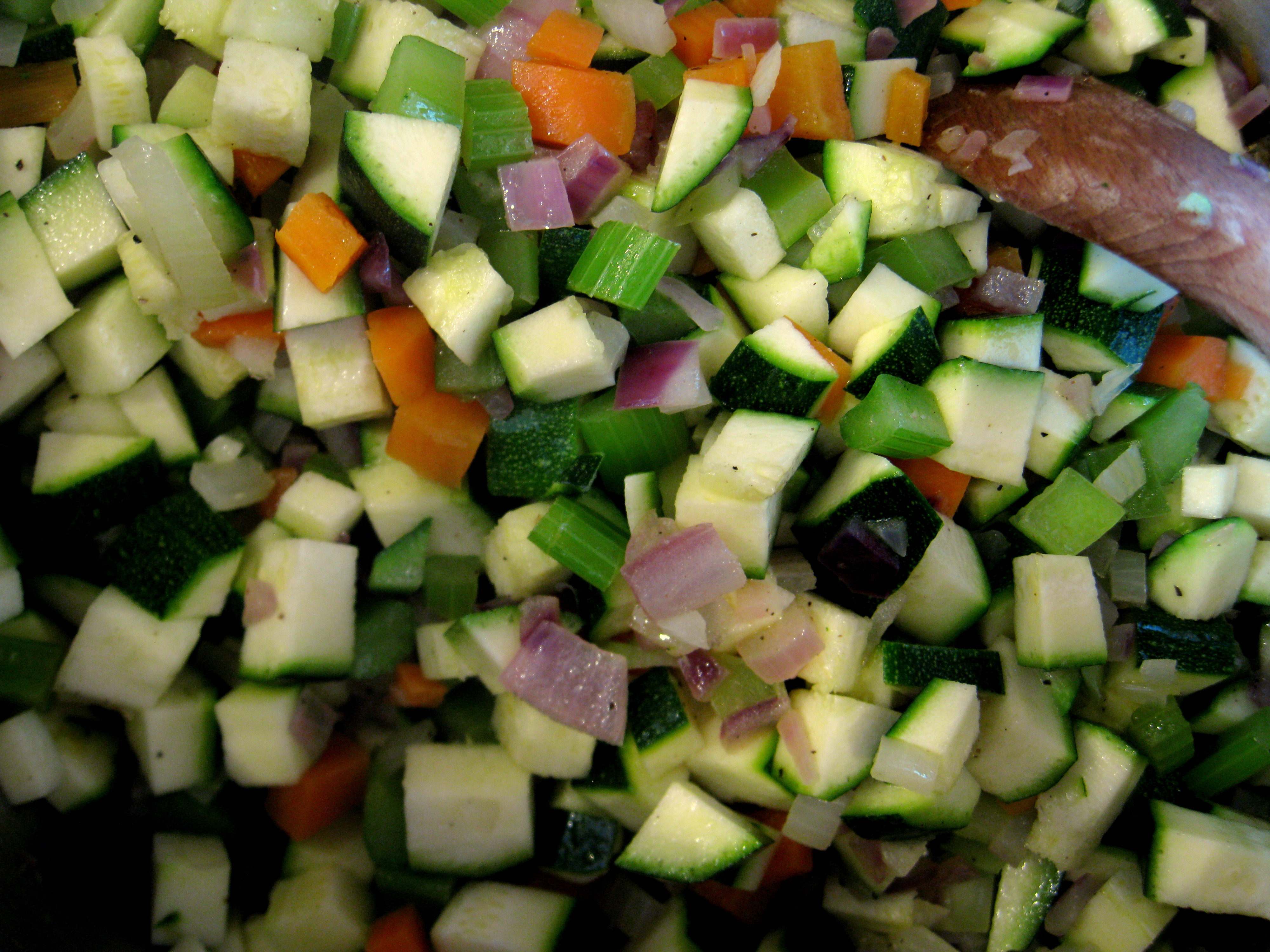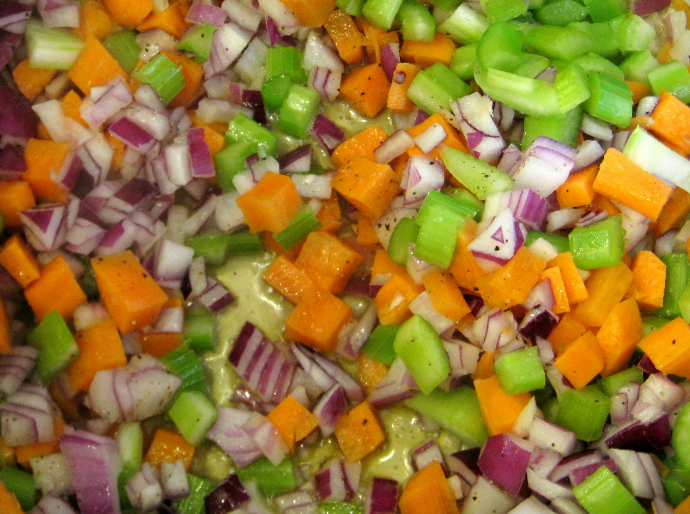 Start by heating some olive oil in a very large sauce or stock pan. On a medium-low heat, cook the chopped onion, carrot and celery for about 5 minutes.