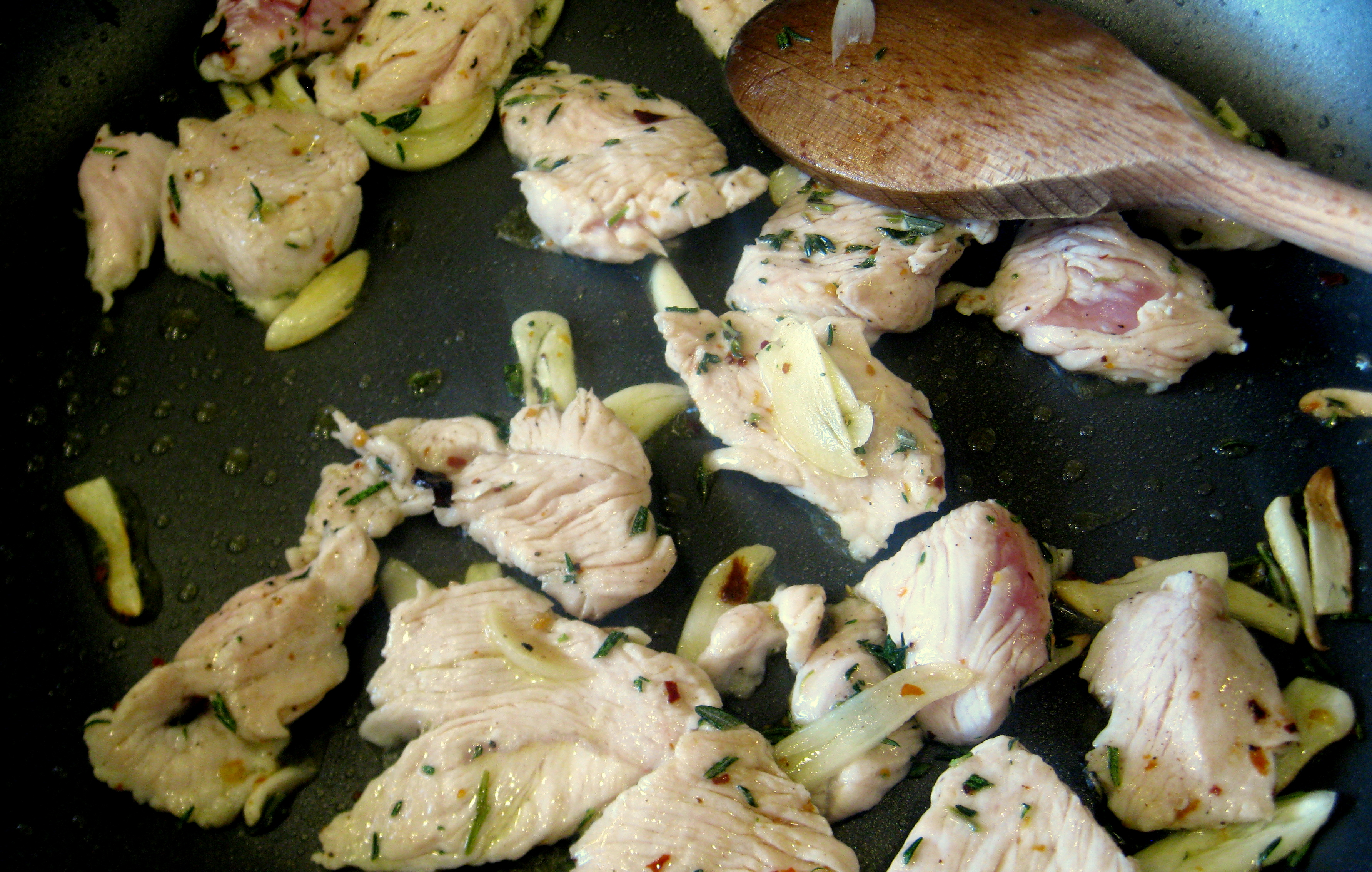 Add the chopped garlic, chilli and chopped herbs (you could also use chopped sage) and fry on a medium-high heat for a few minutes, stirring to prevent anything from catching on the bottom of the pan.